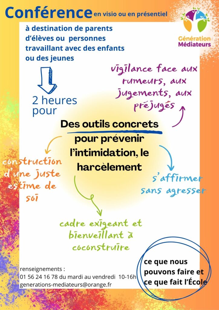 À la demande des établissements scolaires ou des associations de parents d’élèves, Génération Médiateurs propose une conférence destinée particulièrement aux parents, pour proposer d’une part des pistes de prévention au harcèlement, à l’intimidation et d’autre part pour expliquer la prise en charge d’éventuelles situations de harcèlement.